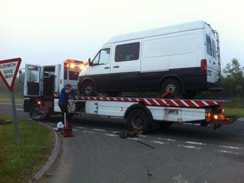 A bit earlier than expected we had our first mechanical problem. Ten minutes off the ferry in Wales we got a sudden vibration in the rear wheel. We pulled in just in time. All but one of the wheel nuts had sheared off!! We had a bit of fun phoning UK towing services but eventually a lovely young Welsh man arrived.
