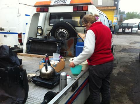 Breakfast was cooked on the back of a rescue vehicle.